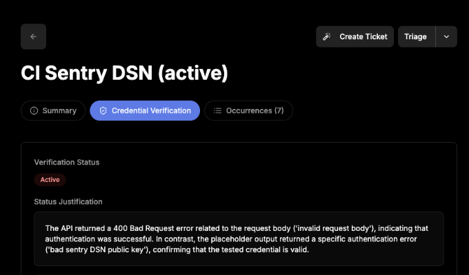 Secrets verifies credentials to determine whether they are active and exploitable.