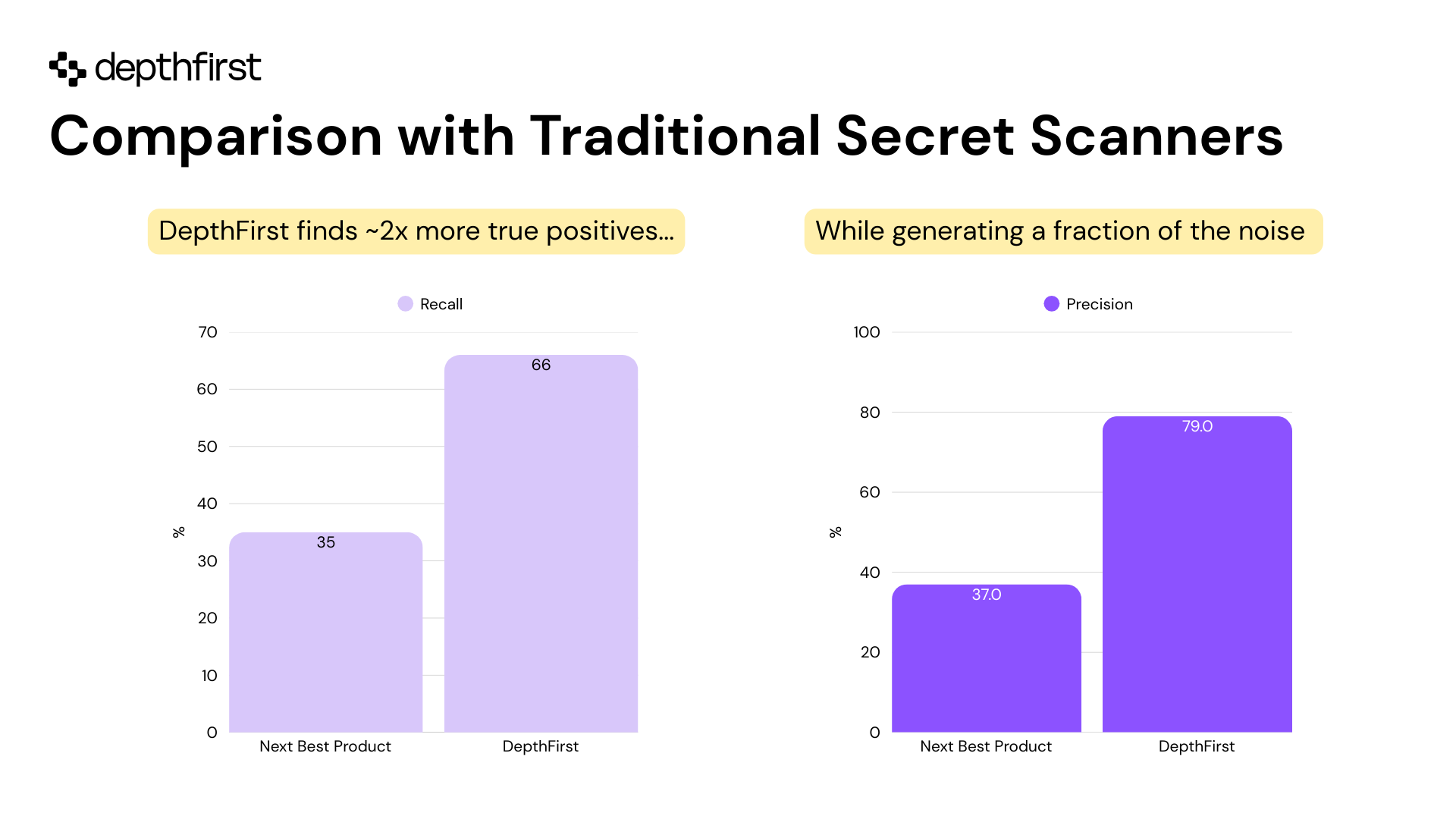 Our LLM-first approach reasons about critical repo context: file types, variable naming patterns, and credential relationships. This allows depthfirst to detect secrets invisible to pattern-matching scanners.
